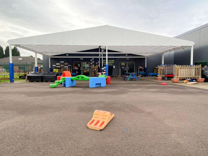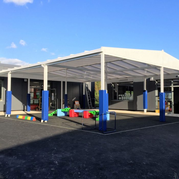 The canopy is an adaption of the Grange Freestanding Mono-Pitch. It maintains all of the benefits of the Grange, with the addition of the ability to cover larger areas making it ideal for event venues, large play areas, outdoor dining areas and outdoor classrooms.
