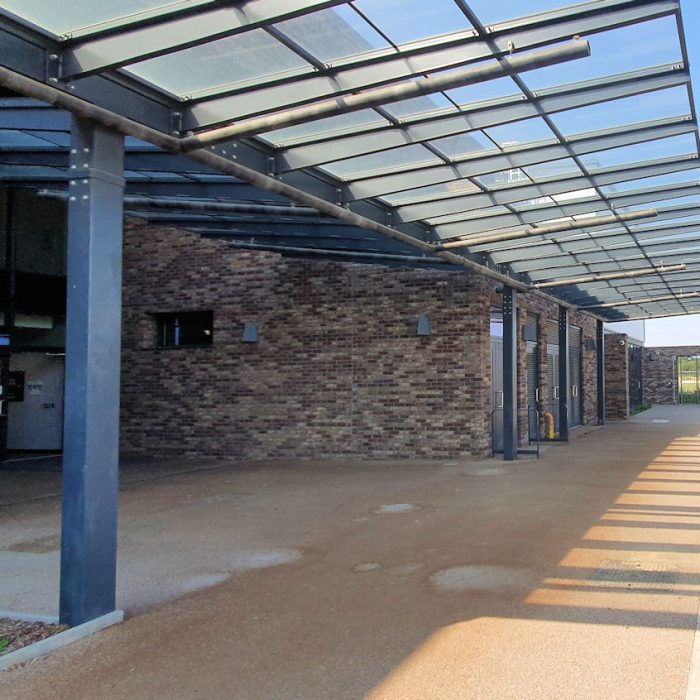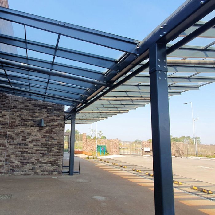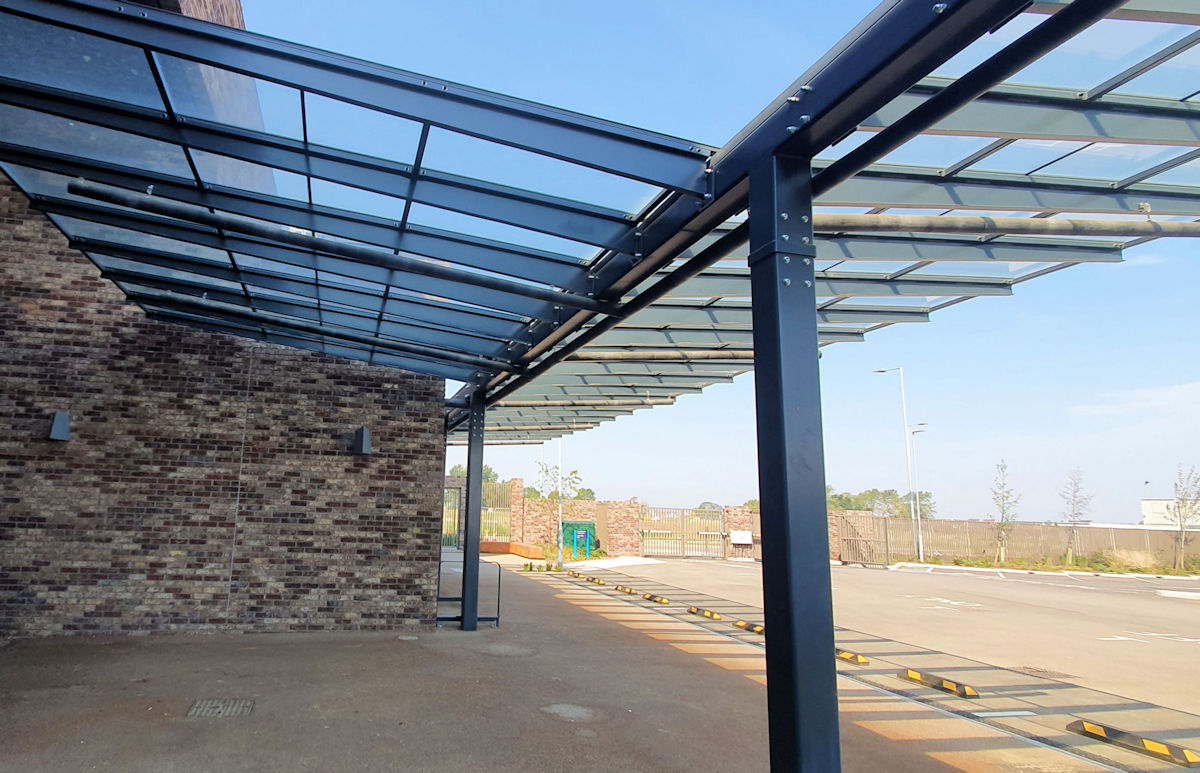 This shade structure has a choice of four roofing options; 10mm toughened glass, 10.8mm laminated glass, 10mm solid polycarbonate or 16mm structured polycarbonate. The frame is constructed from a 200mm x 200mm x 8mm steel box section and is a very well-designed structure that is robust and has a life expectancy of up to 25 years.