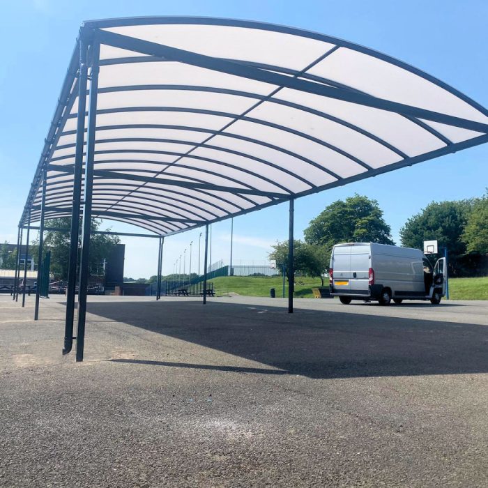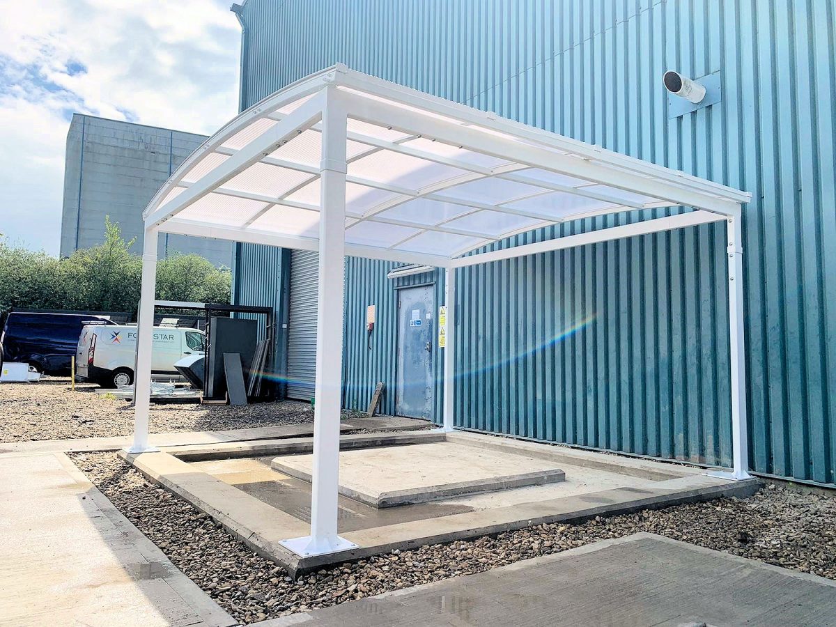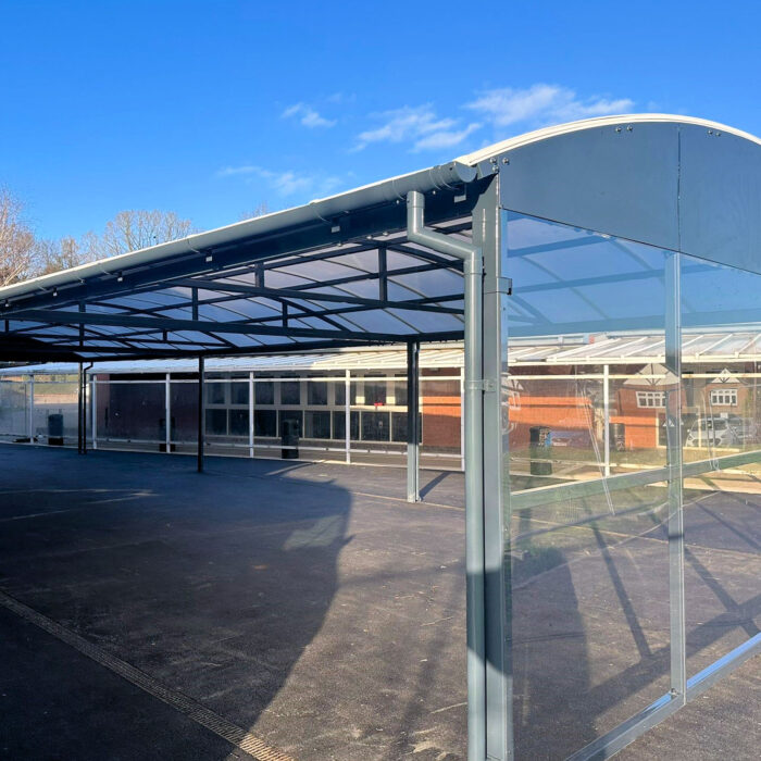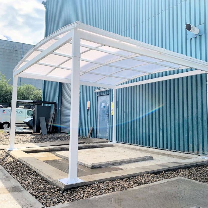This domed roof canopy combines excellent UV protection with high impact resistance and its unique design keeps installation times and on-site disruption to a minimum. The main frame is constructed from strong steel beams that can be galvanised and/or powder coated in the RAL colour of your choice, and the roof is covered with a choice of 5mm solid or 16mm structured polycarbonate roof panels that block over 98% of UV rays and is also vandal and shatter resistant.