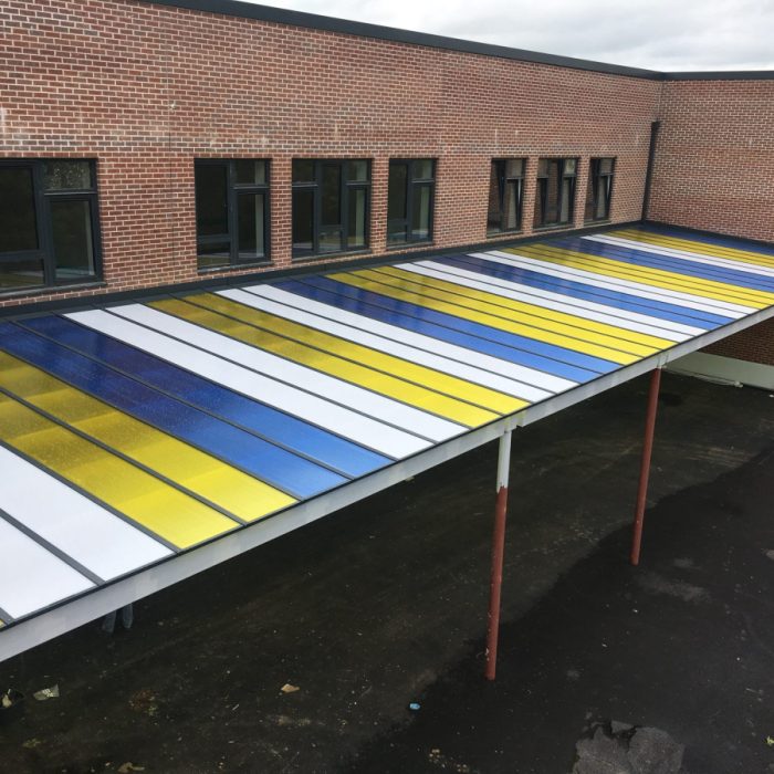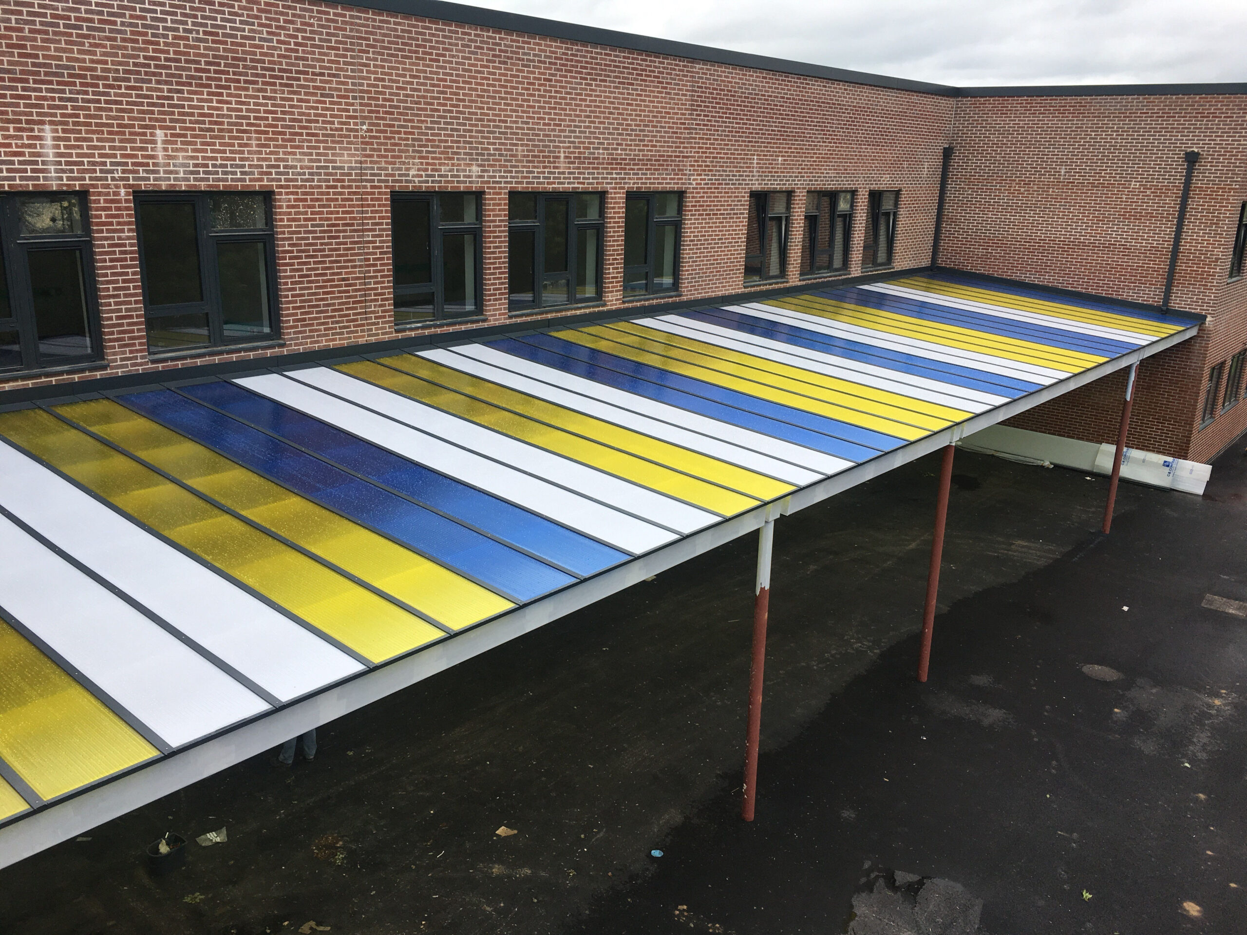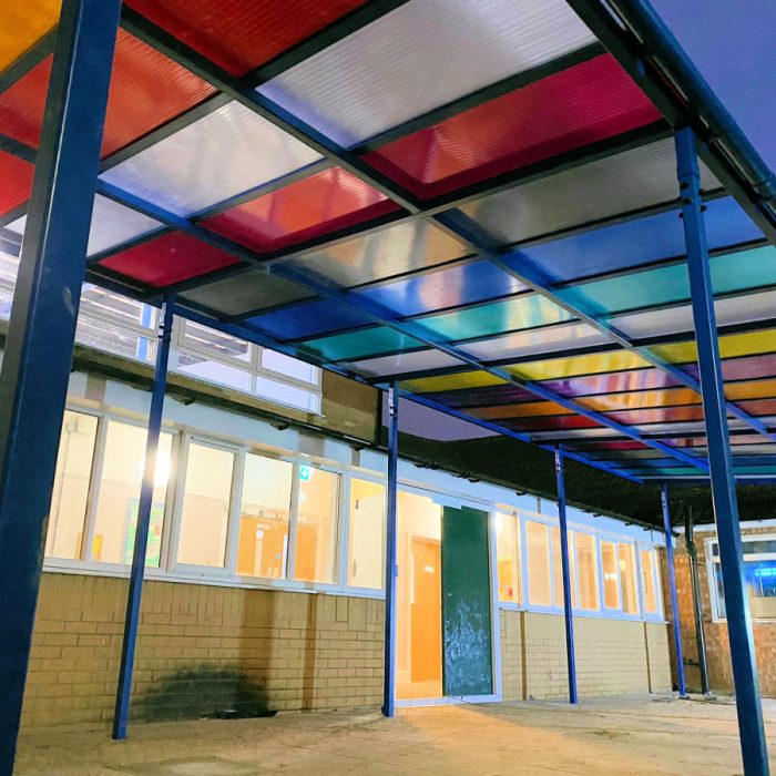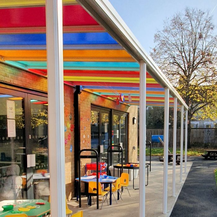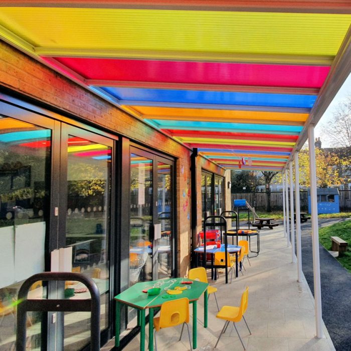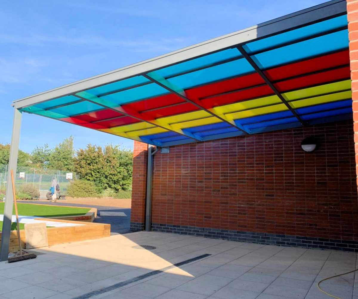 You can choose just the one colour to span across the canopy length. Or alternatively for a brighter and eye catching appearance, you can choose to have multiple colours the alternative in strips along the span of the canopy. This is a popular choice within primary schools and early years settings, it would also be ideal for children’s hospitals visitor attractions that appeal to young children.