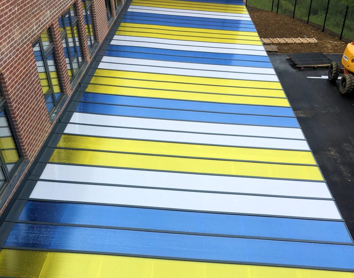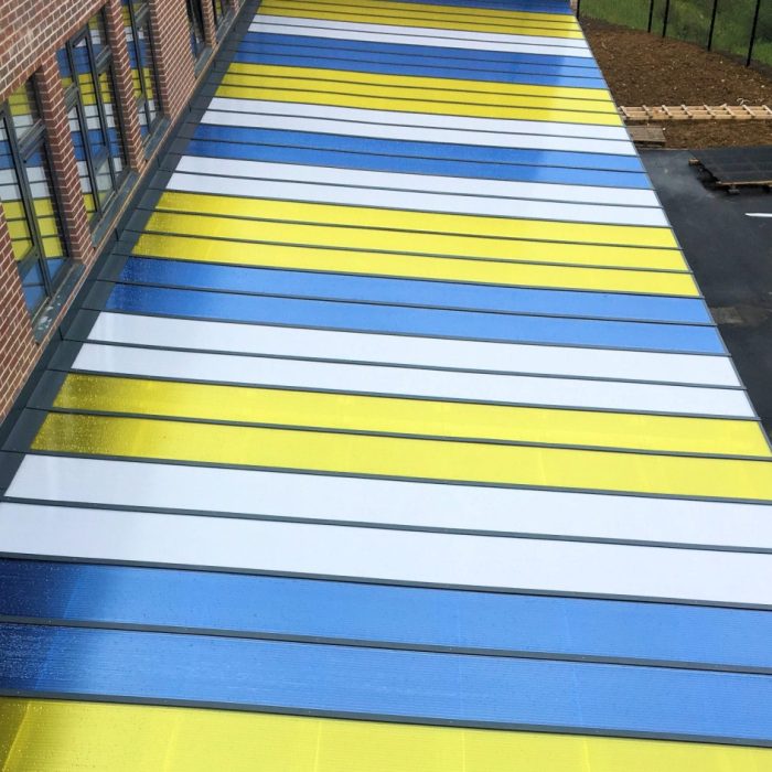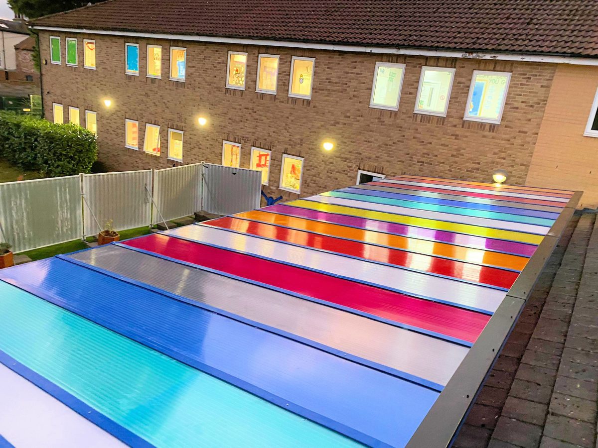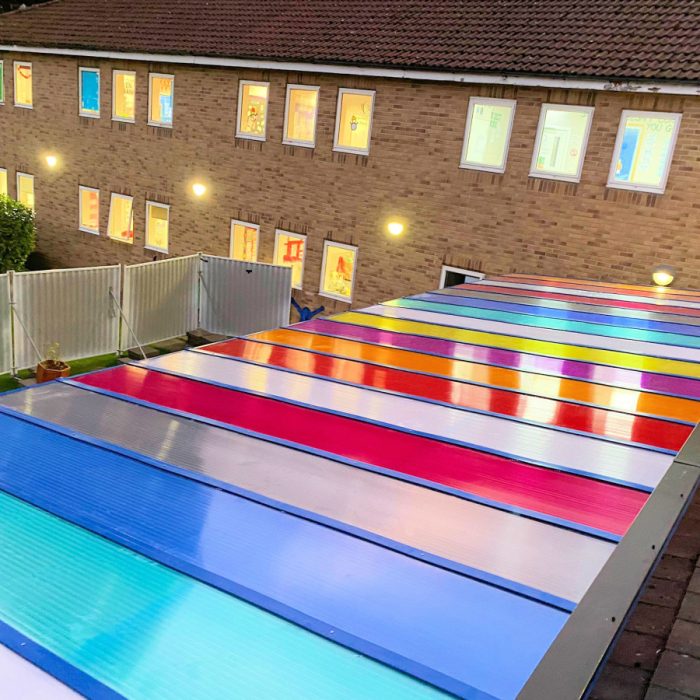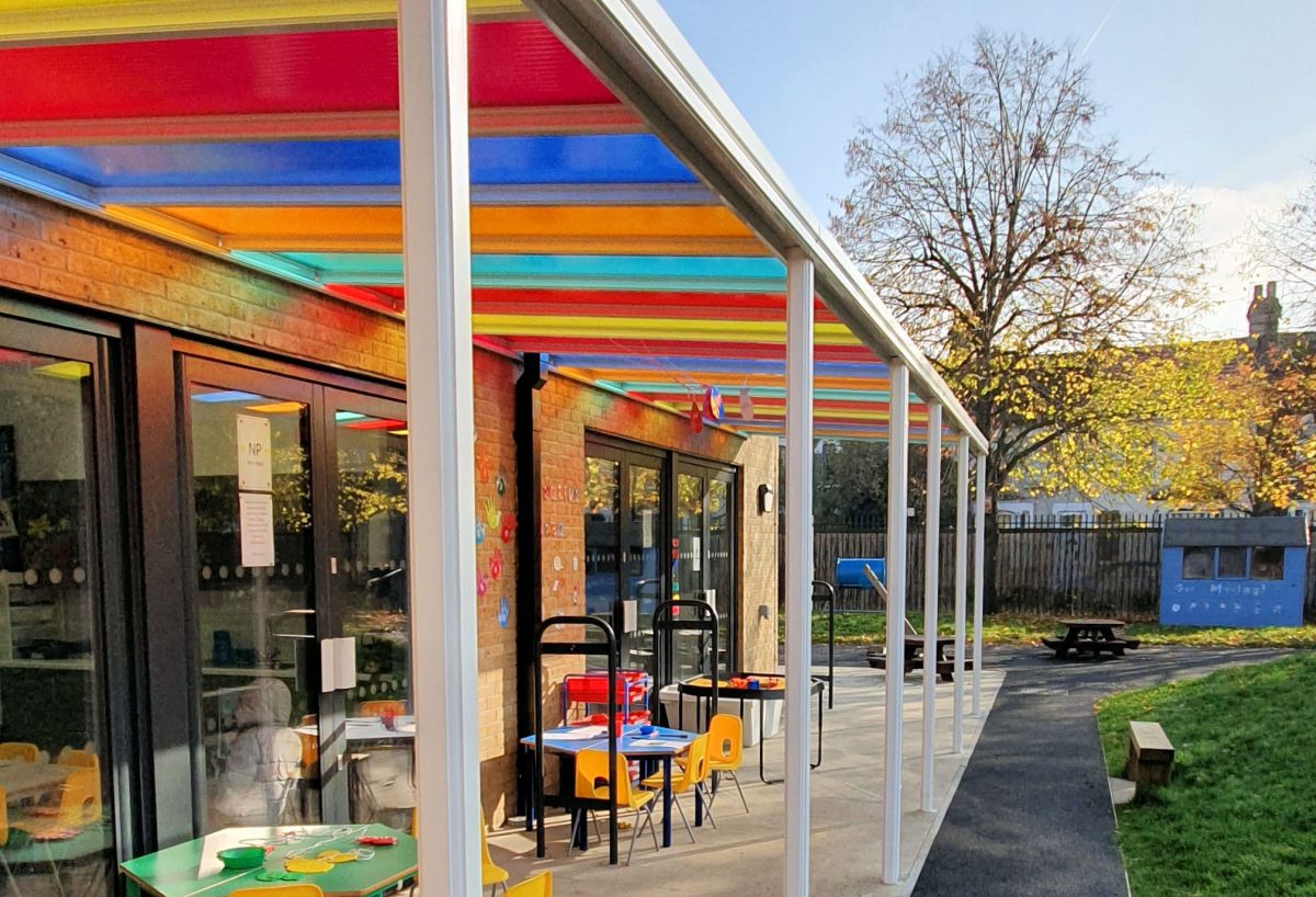You can choose just the one colour to span across the canopy length. Or alternatively for a brighter and eye catching appearance, you can choose to have multiple colours the alternative in strips along the span of the canopy. This is a popular choice within primary schools and early years settings, it would also be ideal for children’s hospitals visitor attractions that appeal to young children.