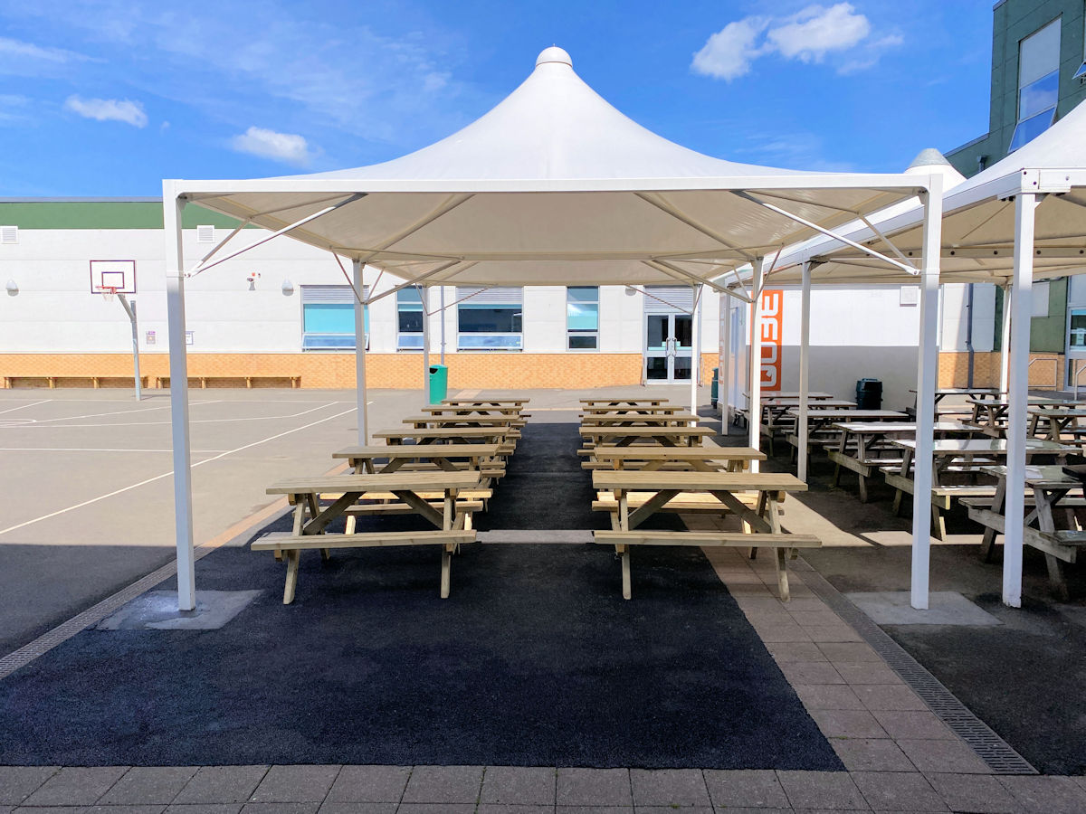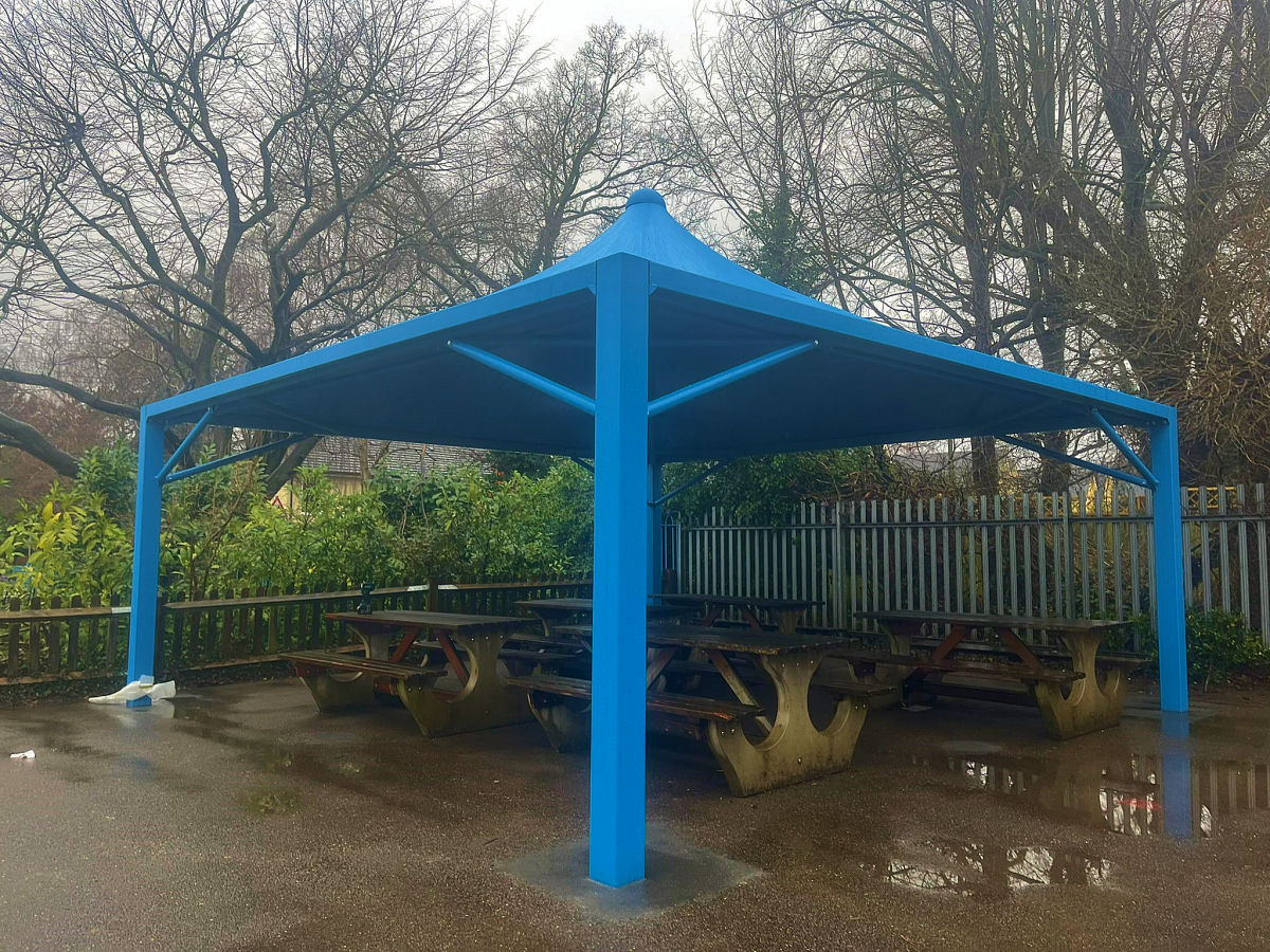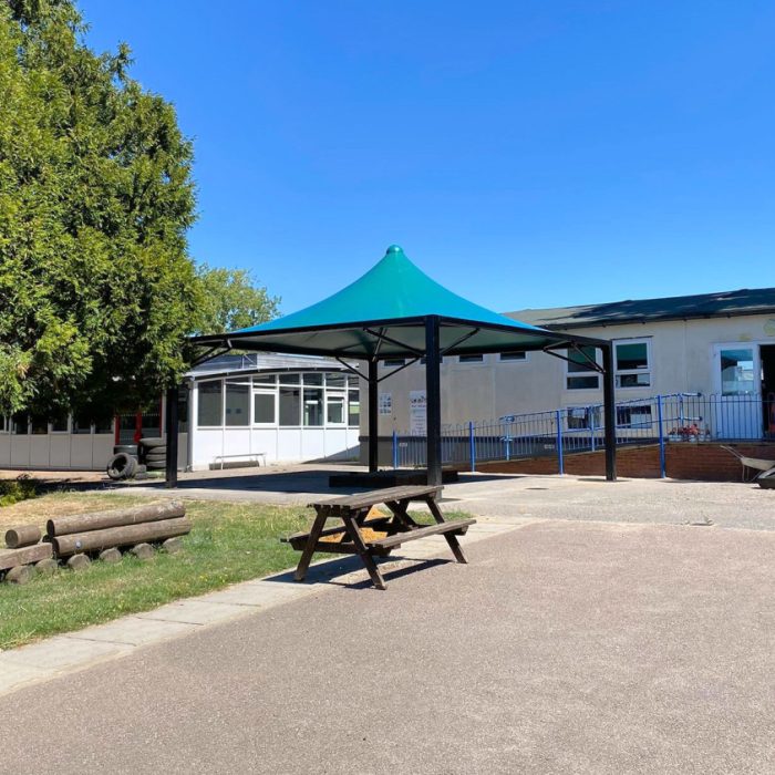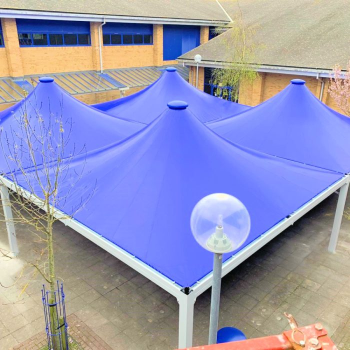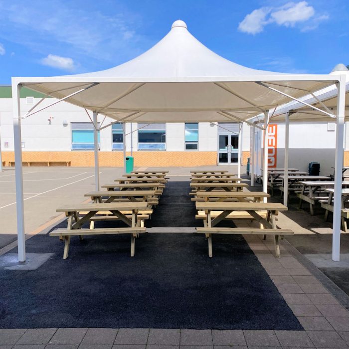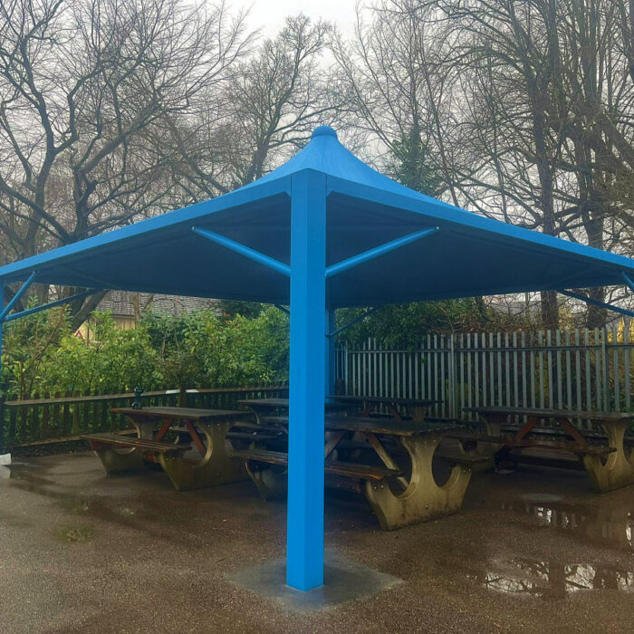The Windsor is an attractive steel canopy covered with waterproof tensile fabric, which is available in 17 vibrant colours. It is available in a range of sizes from 4m x 4m to cover a small-medium area or up to 9m x 9m. More than one canopy can be installed together to create weather protection to much larger areas, making it ideal for covering outdoor dining areas within schools and commercial settings.