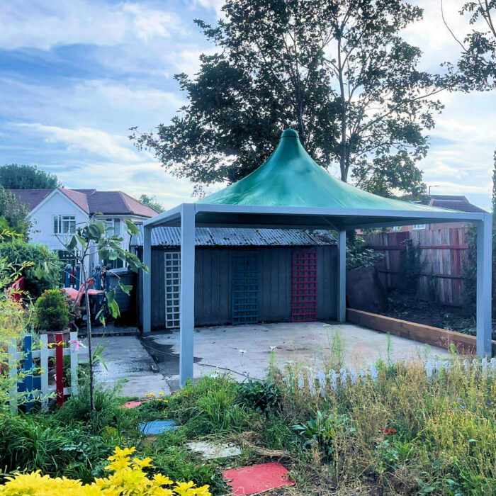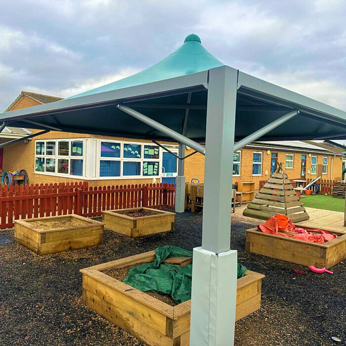 The Evershade is a steel framed waterproof tensile structure that has a shade sail design with the aesthetics of a full canopy frame rather than just posts. It is available in sizes from 3m² to 6m² and multiple sections can be added together to create extra-large structures, allowing you to cover large outside dining areas or outdoor play and learning areas outside. Due to its durability and cost-effective design, this shade sail canopy is perfect for organisations who would like a waterproof shade sail but at a lower cost.