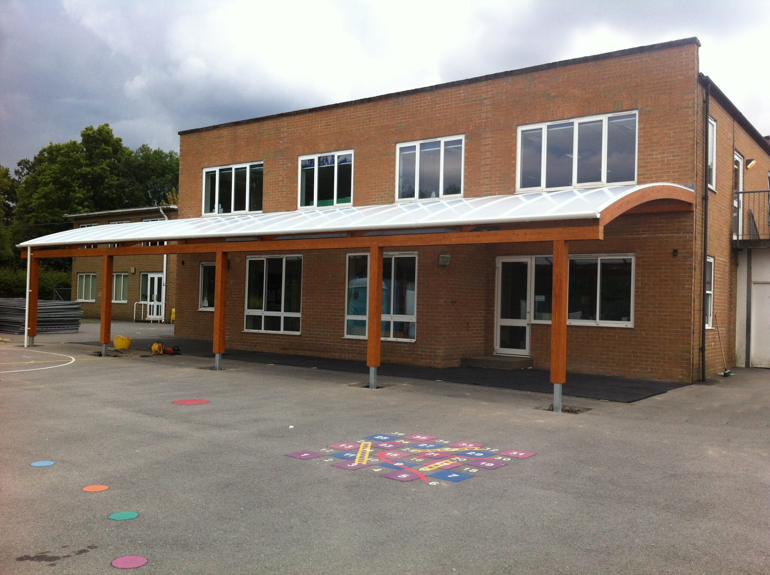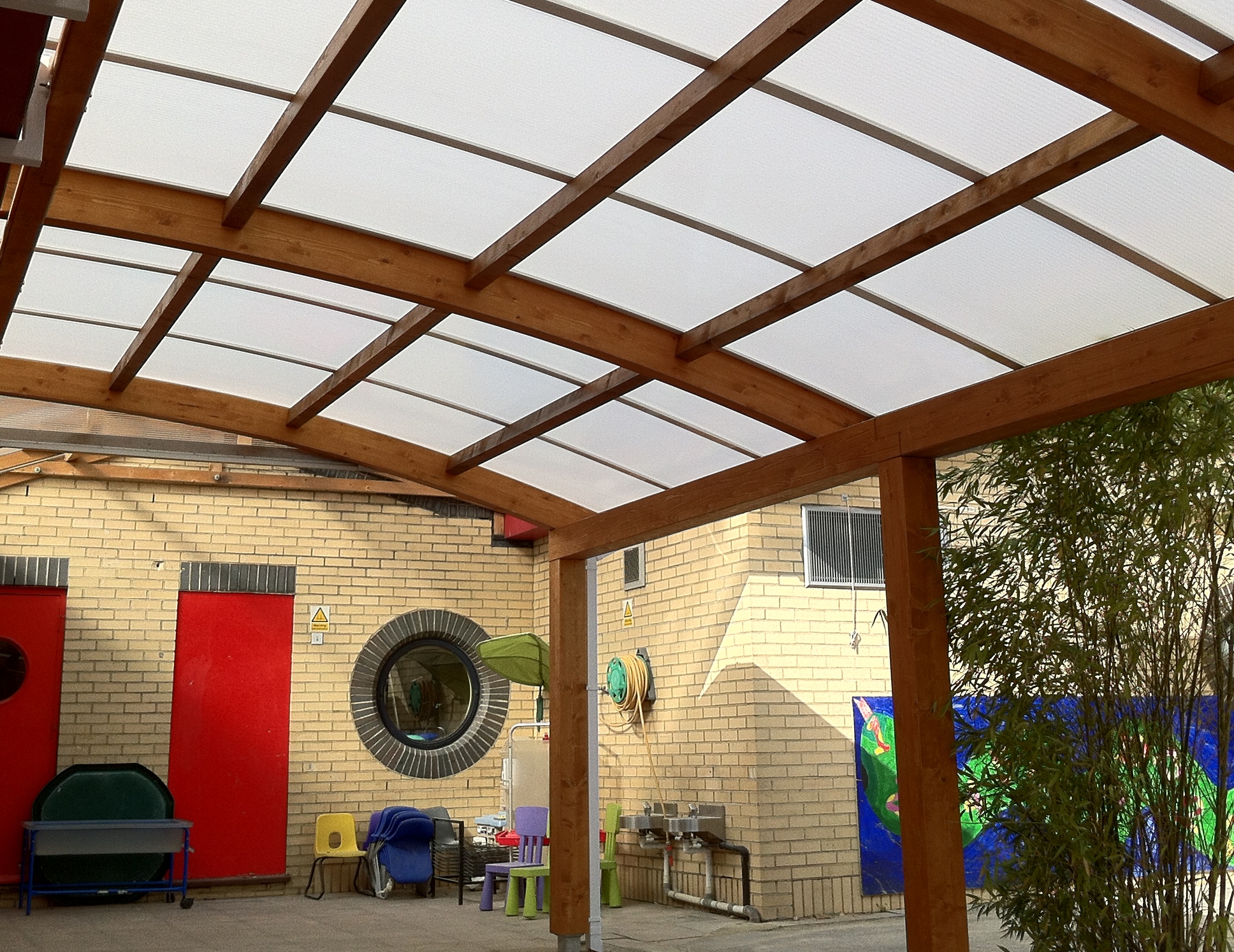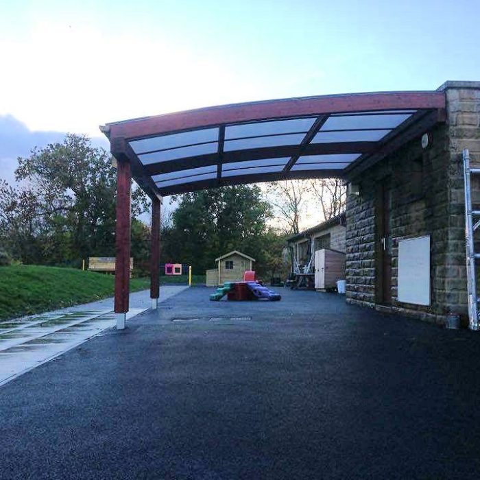 This permanent timber structure is ideal for creating a contemporary sheltered area adjacent your existing building. You can use the Tarnhow Curved Wall Mounted Canopy for many applications including a covered walkway, playground canopy, entrance canopy and a covered outdoor dining area.