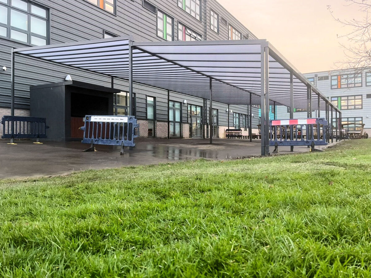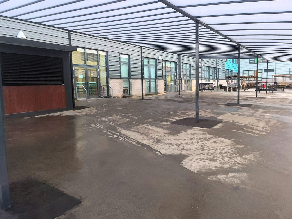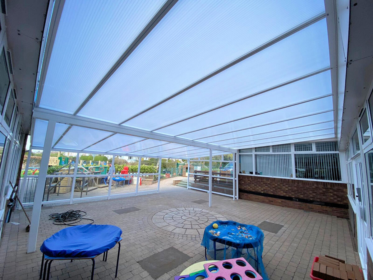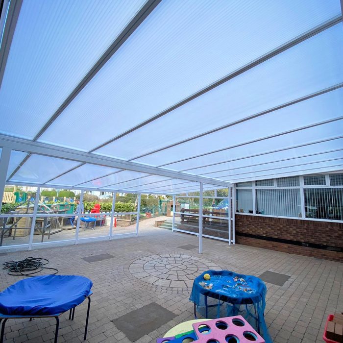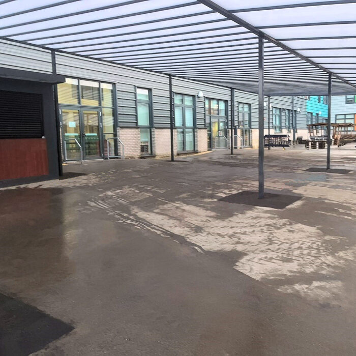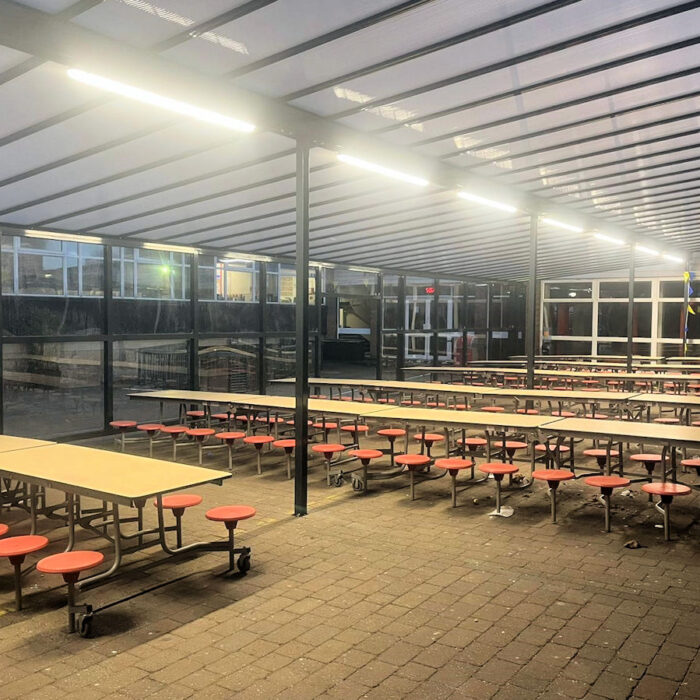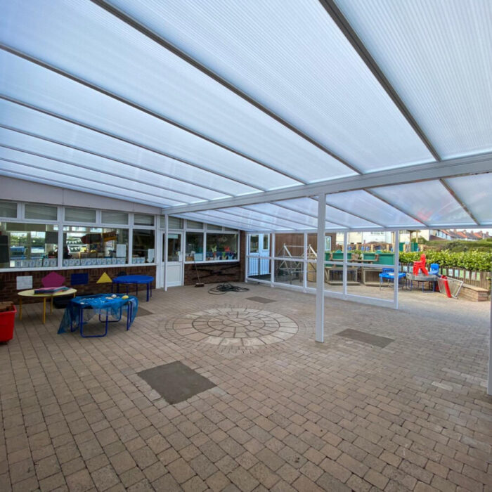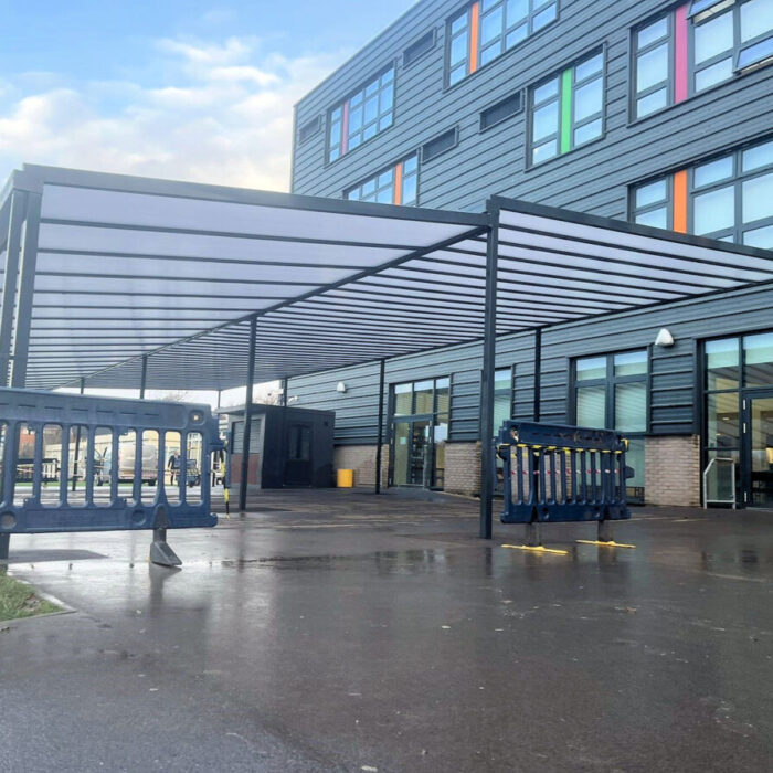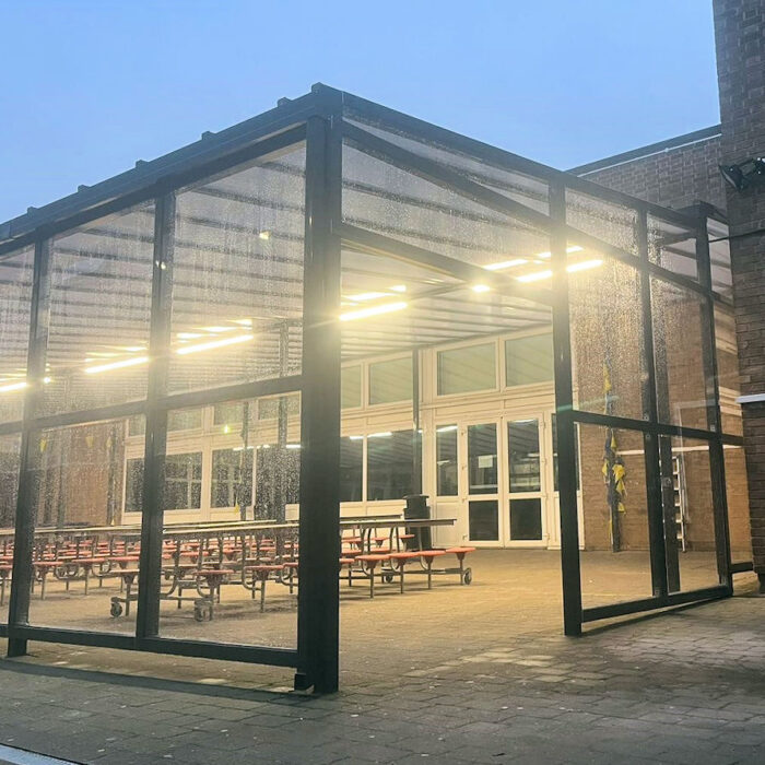 It is covered with 35mm structured polycarbonate roof panels which are vandal and shatter resistant and are 200 times stronger than glass. During the manufacturing process, the panels are coated with a special UV coating. This UV coating stops the panels from yellowing overtime due to exposure from the sun, unlike the alternative panels on the market that can turn yellow over time. This coating also ensures the panels protect those underneath from over 98% of the sun’s harmful UV rays, making it perfect for well used areas including schools and hospitals, helping to protect those underneath from sun damage.