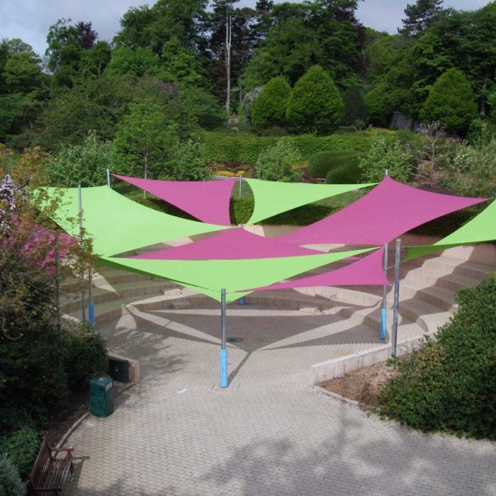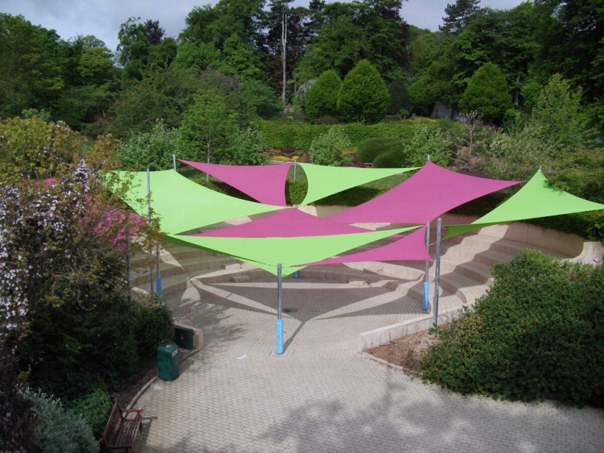 Because they are covered with knitted tape and monofilament yarn, our sun shade sails are not waterproof and are therefore only ideal for creating shade from the sun rather than shelter from the rain. We have a range of waterproof tensile fabric structures and waterproof shade sails which provide protection against all weather conditions.