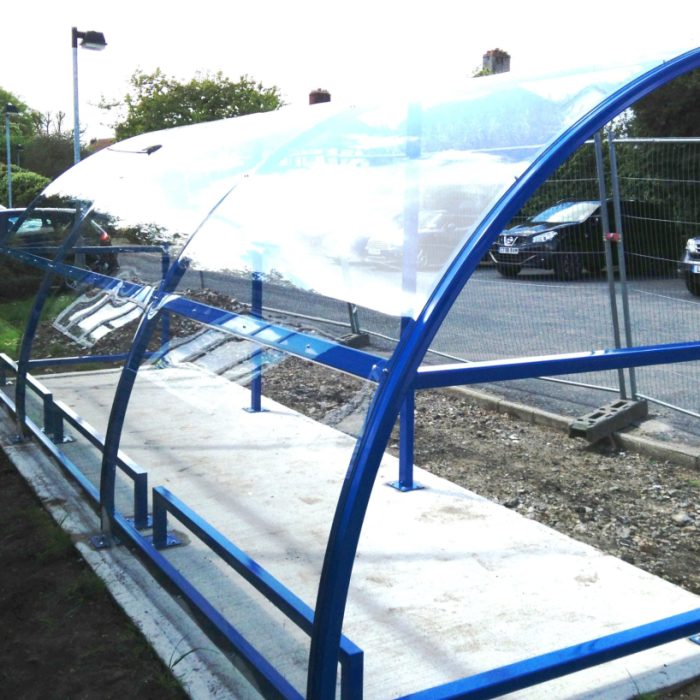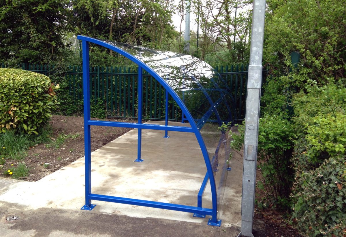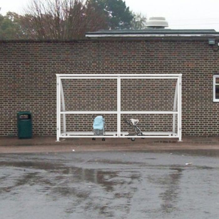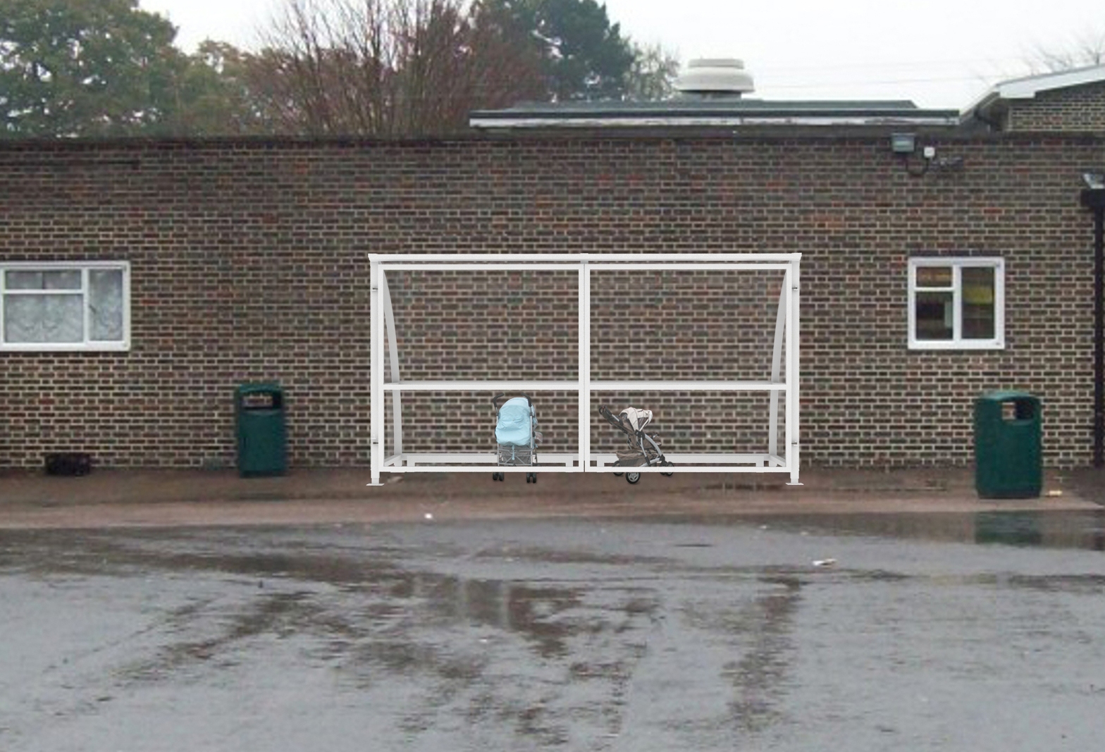 This permanent shelter is constructed from a robust steel frame and is covered with 5mm solid polycarbonate roof panels which are available in clear or opal. Polycarbonate side panels are available on request at an additional cost. A standard shelter measures 4.1m x 1.7m and can hold on average up to 6 buggies, it can also be extended by 2m bays to store additional buggies.
