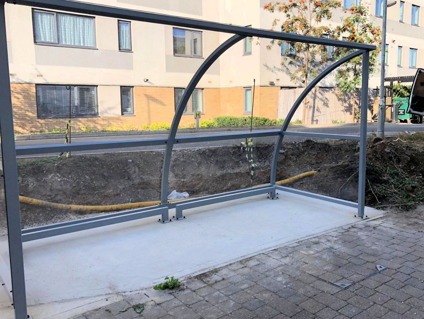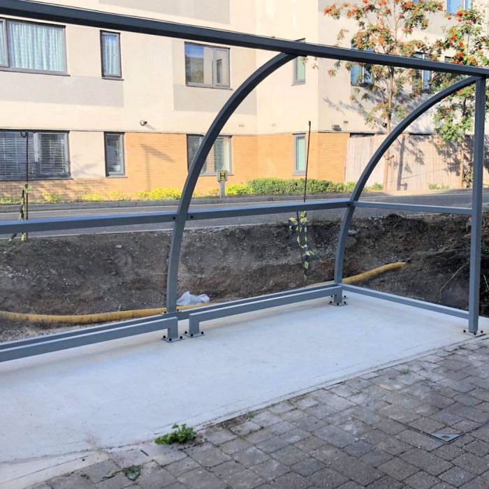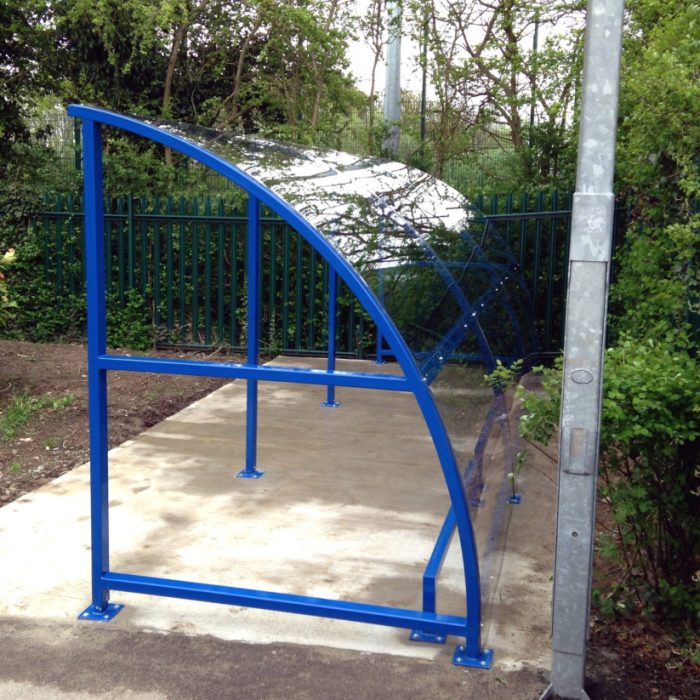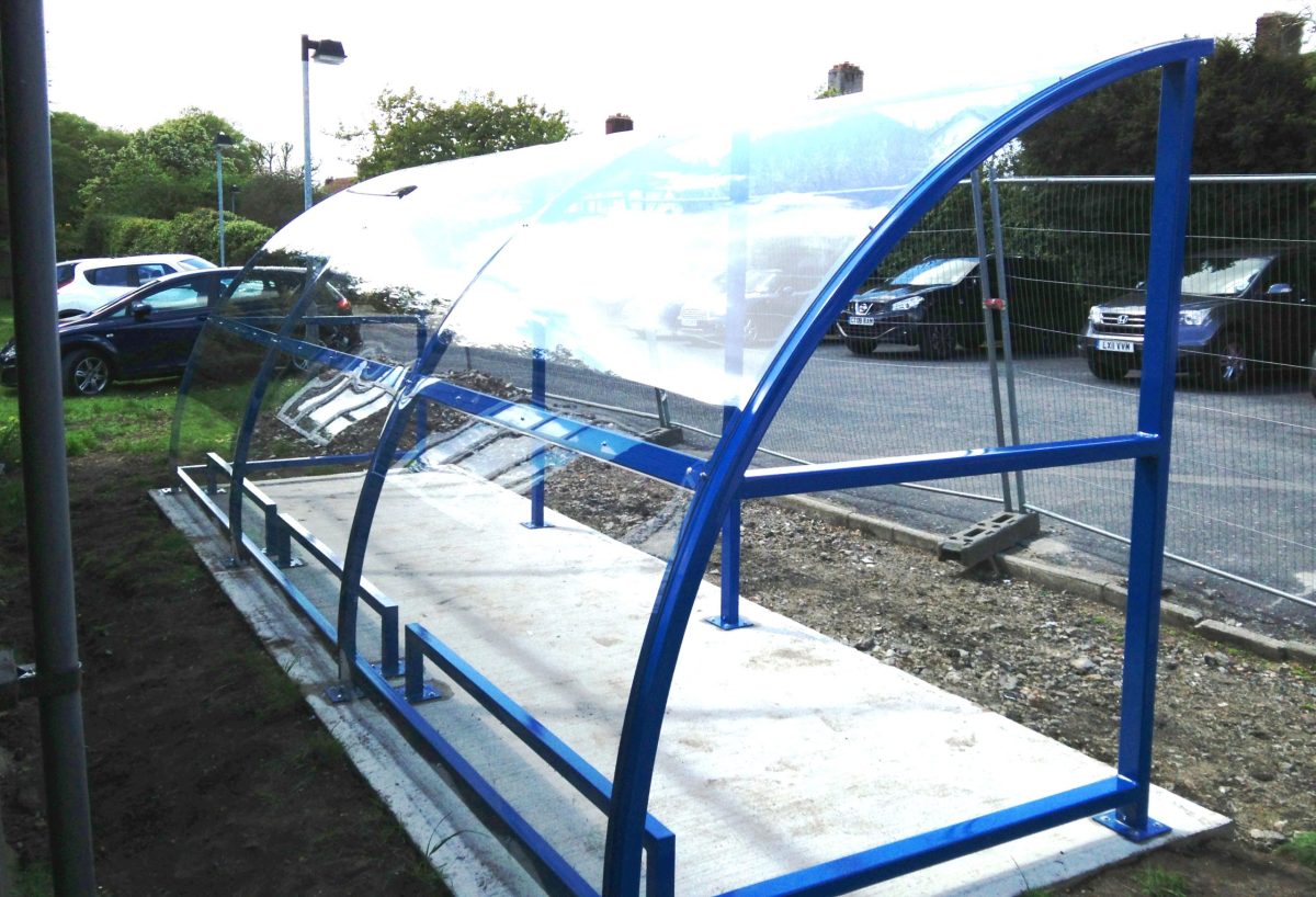 This permanent shelter is constructed from a robust steel frame and is covered with 5mm solid polycarbonate roof panels which are available in clear or opal. Polycarbonate side panels are available on request at an additional cost. A standard shelter measures 4.1m x 1.7m and can hold on average up to 6 buggies, it can also be extended by 2m bays to store additional buggies.