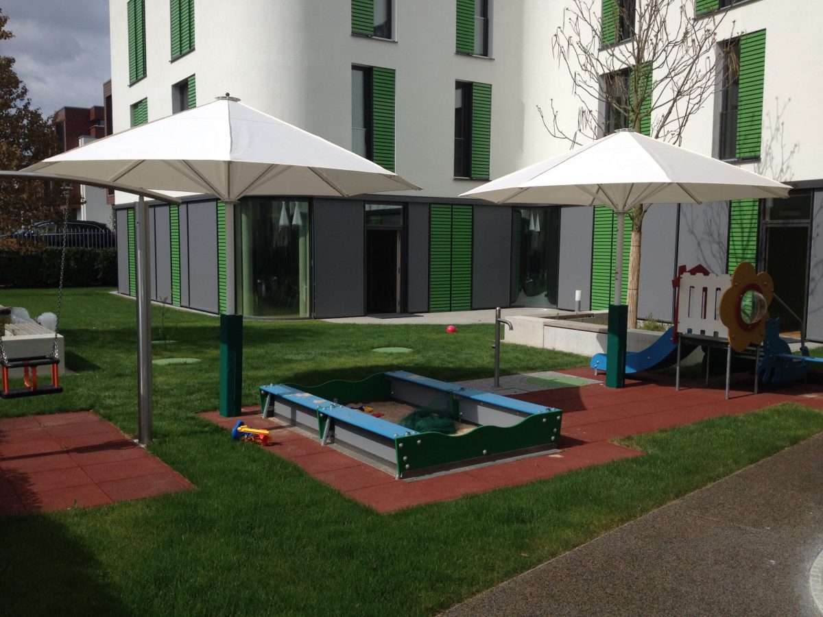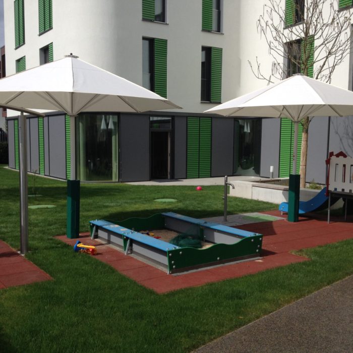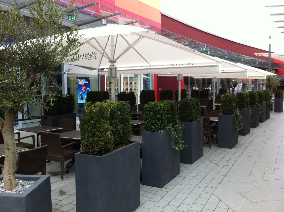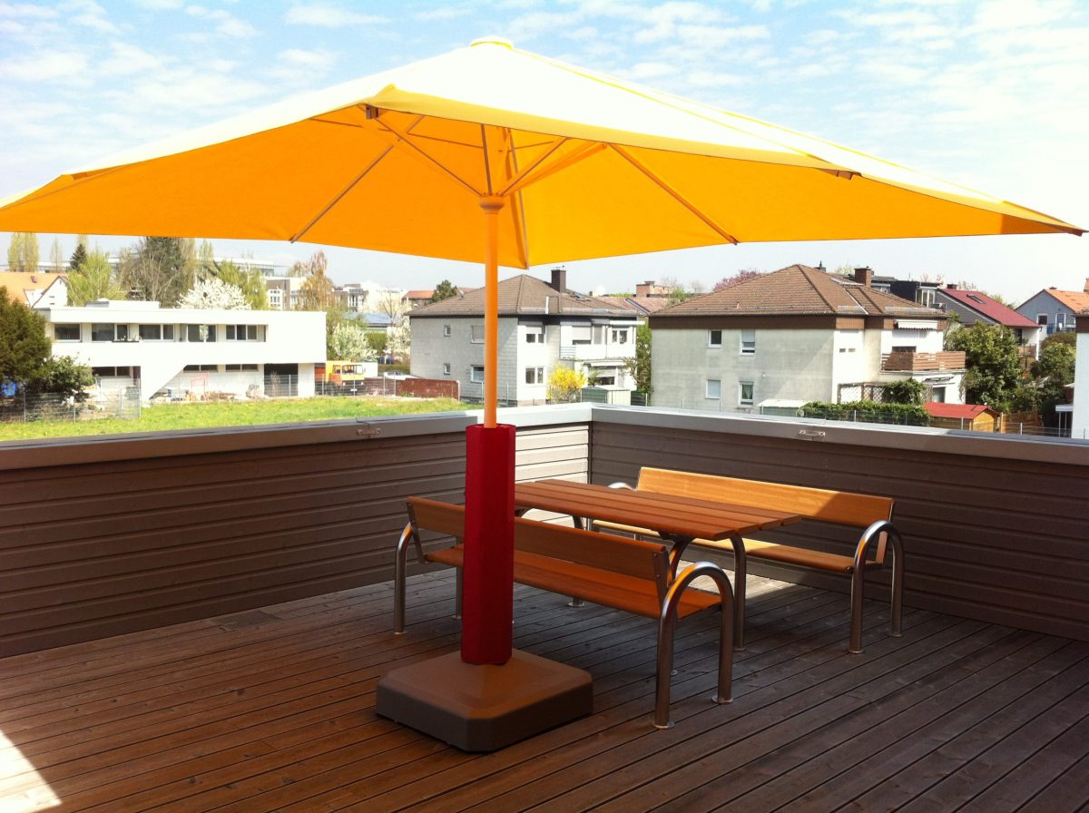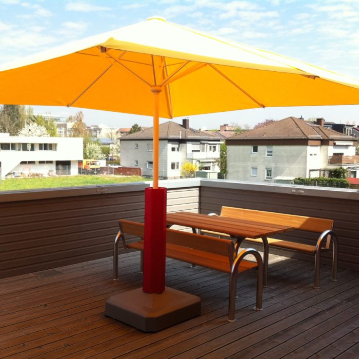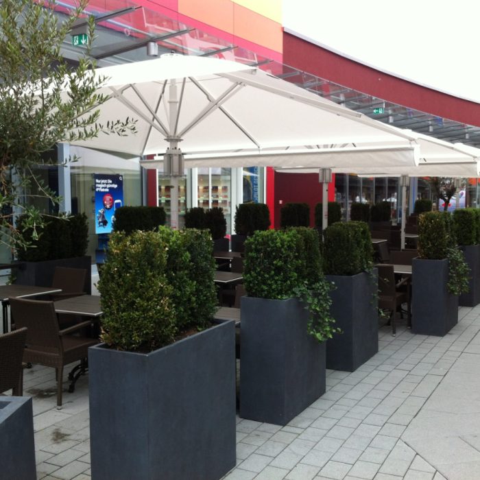 The Drayton is our classic umbrella covering from 4 up to 27 square metres and is available in three shapes: round, square and rectangular. Available in 39 different sizes in half metre steps, there’s sure to be the right size to suit any setting. Suitable for outdoor eating and drinking areas, patios, play-areas, decking or any other outdoor setting, the Drayton is constructed with a high quality aluminium frame and state-of-the-art gearbox which is guaranteed for 5 years. Adjustable, spring-loaded end pieces in the arms ensure automatic retightening of membranes as well as quick and easy replacement and the umbrella can be branded with any corporate identity.