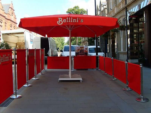 A selection of our umbrellas can have the fabric printed with images or text of your choice including your logo and strap line. When passers-by are walking along the street, looking for a business like yours they will be able to notice your premises quickly and easily with your logo on top of your umbrellas.