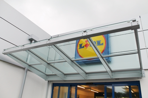 After a lot of toing and froing, I have finally chosen my favourite retail canopy installation! It’s a wall mounted entrance canopy that we installed earlier this year at the well known supermarket chain Lidl. We installed it at their new store in Waterlooville in Hampshire.