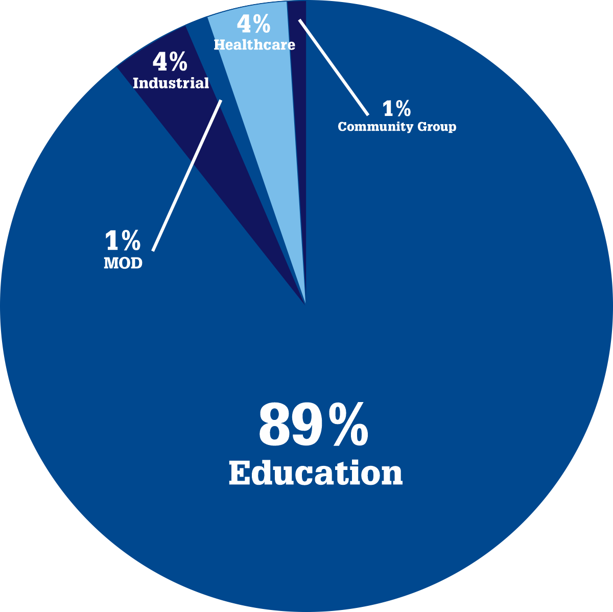 The end users consisted of 89% education (including schools, nurseries, colleges and universities), 4% industrial (such as commercial buildings), 4% healthcare (including hospitals, doctor surgeries and care homes), 1% community groups and 1% the MOD.