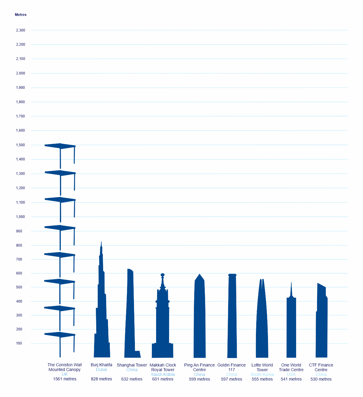 The total length of Coniston aluminium canopies we installed in 2022 was a whopping 1,561 metres. That’s almost double the length of the worlds tallest building; the Burj Khalifa and almost triple the length of the One World Trade Centre; the tallest building in the USA.