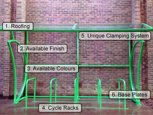 Our shelters are all fitted with Sheffield Linked Cycle Racks which are constructed from 42.4mm steel tube. We can supply our cycle shelters as BREEAM compliant if required, please call us on 0800 389 9072 or email us for more information. You can also choose to have your cycle racks powder coated to match the colour of your shelter.