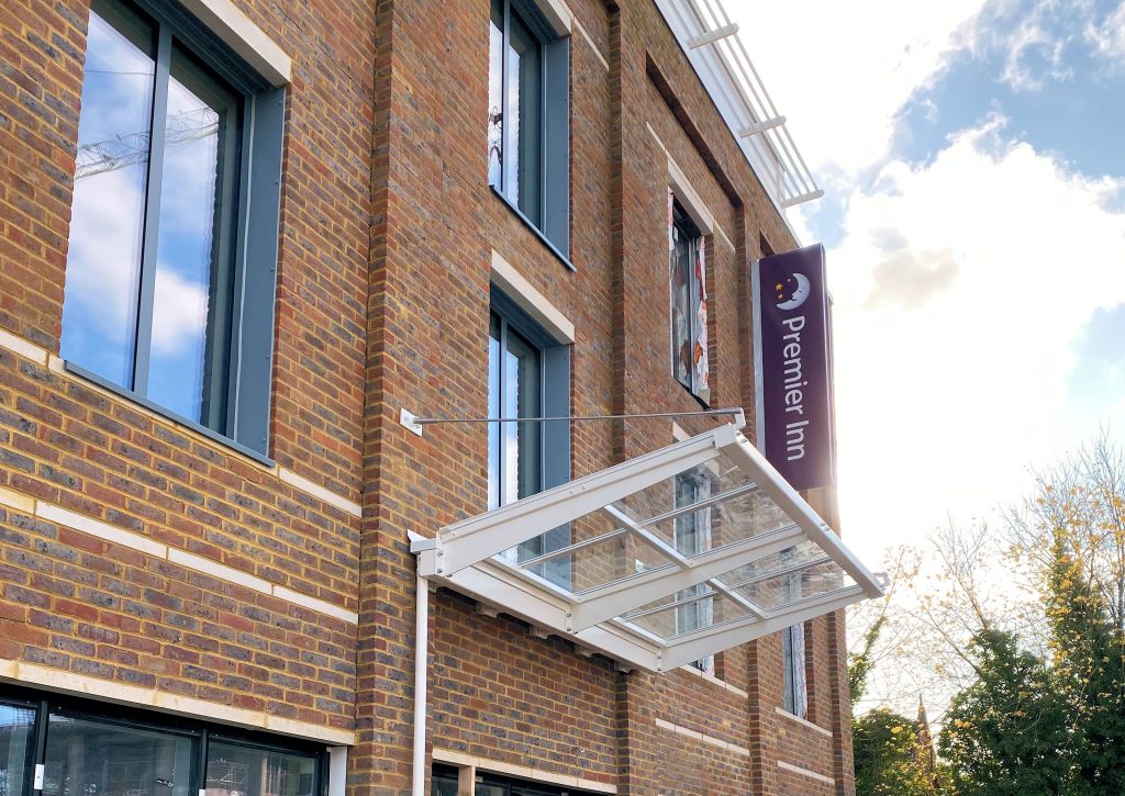 PDR Construction approached us to tender for the entrance canopy works at a brand-new building they were constructing for the Premier Inn hotel chain in Haywards Heath, West Sussex. The canopy requested by the architect working alongside PDR Construction was of a similar specification to our Kensington Wall Mounted Entrance Canopy, so we therefore put this product forward in our tender.