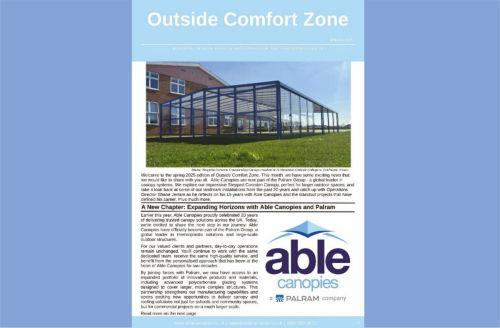 Welcome to the spring 2025 edition of Outside Comfort Zone. This month, we announce that we have joined the Palram Group, we explore our impressive Stepped Coniston Canopy, perfect for larger outdoor spaces, and take a look back at some of our landmark installations from the past 20 years. We also catch up with Operations Director Shane Jerram as he reflects on his 15 years with Able Canopies and the standout projects that have defined his career. Plus much more.