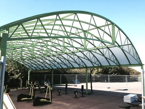 This large 16m x 11m structure was installed to provide cover for existing outdoor gym equipment, and to make the area bright and appealing the canopy was coloured Yellow Green to create a vibrant, energetic area that complement the colours of the gym equipment and inspired the students to exercise.