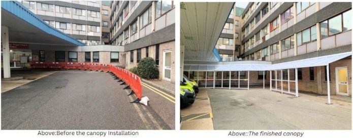 The result is a generous covered walkway and outdoor queuing area that now provides year-round protection for patients, visitors, and staff, improving comfort and access at a critical hospital entrance.