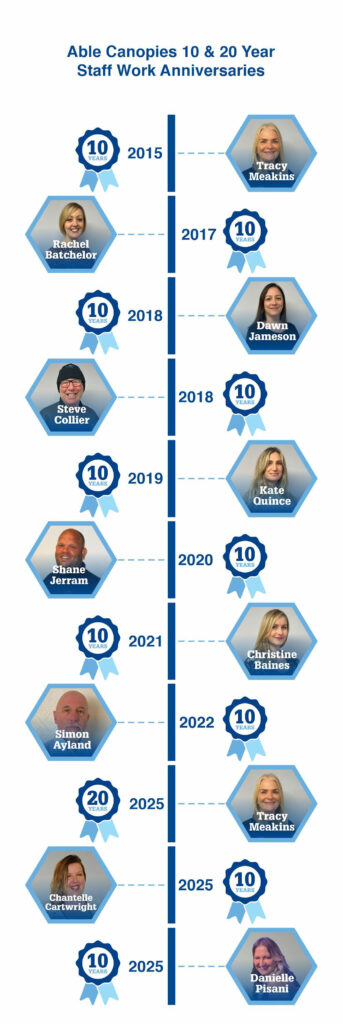 At Able Canopies, our team is at the heart of everything we do. As we celebrate our 20th anniversary as a company in 2025, we are also taking the time to recognise and honour the incredible dedication and hard work of our employees who have reached significant career milestones with us.