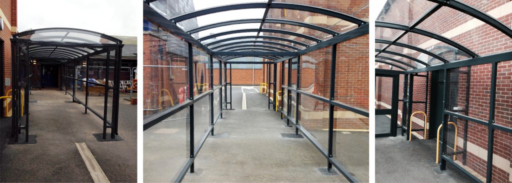 As sites grow, facilities such as car parks and additional buildings can become separated from the main building or site, making the area feel a little disjointed. A walkway canopy can lead the way from the car park or new buildings to the main building and keep staff and visitors dry when walking from one place to another. Covered walkways can reduce the risk of staff or visitors slipping over in the rain as the area underneath will be dryer, reducing the need for any mad dashes in the rain.