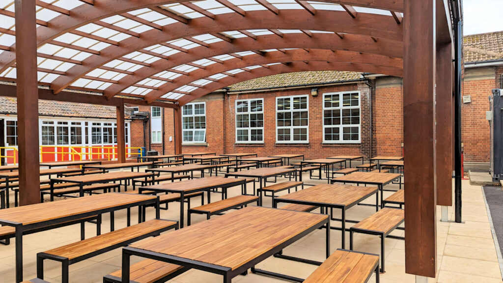 The result? Covered outdoor dining areas seating over 380 pupils across both sites, dramatically easing congestion inside the dining halls while giving students more space and fresh air during break times. The canopies not only solved a practical challenge but also enhanced the aesthetic appeal of the campuses with their striking Glulam frames in a Nutwood finish.