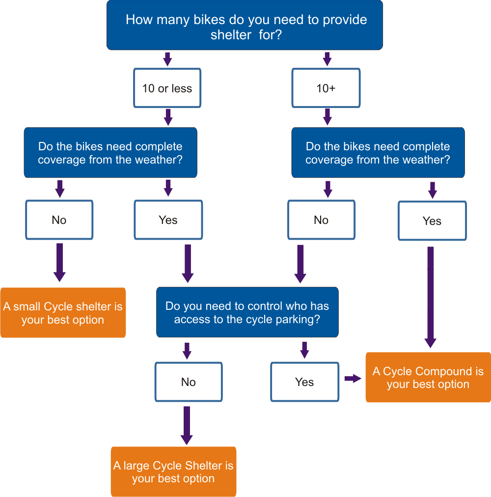 If you’re considering a sheltered cycle parking solution but are not sure which is best for you can use this simple diagram to find out which is your best option. Alternatively give our friendly Sales Advisors a call and they will go through all your requirements in detail to find the perfect solution for you.