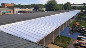 Back in August 2016, we installed our largest canopy yet; a 112m x 5.4m Coniston Wall Mounted Canopy to create a large walkway that can also be used for outdoor learning and play. You can view the installation details and photos here > 112m Coniston Wall Mounted Canopy at Mead Primary School