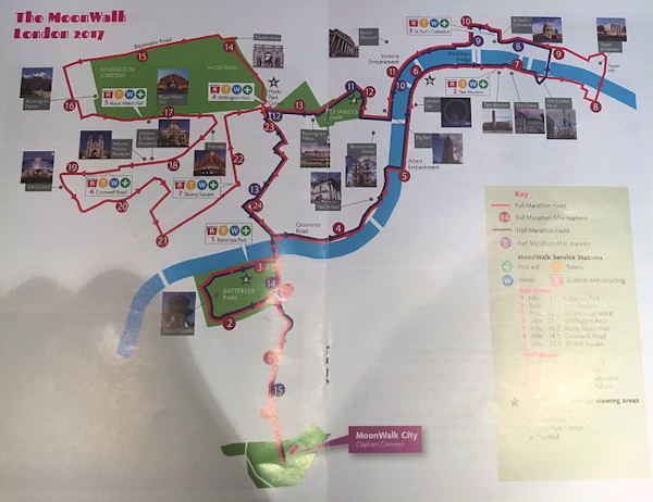 The London Moonwalk covers the distance of 26.2 miles through the streets of London (the same distance as the London Marathon), yet it starts at midnight so those taking part endure the very long walk when all their bodies want to do is sleep. You can view the route here which starts and ends at Clapham Common.