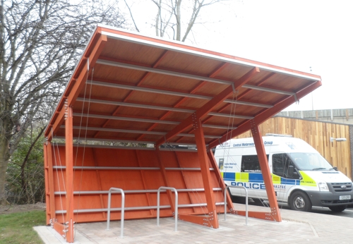 This Timber Cycle Shelter was designed and manufactured by Able Canopies Ltd. and installed at the Motorway Patrol Group in Birmingham , West Midlands.