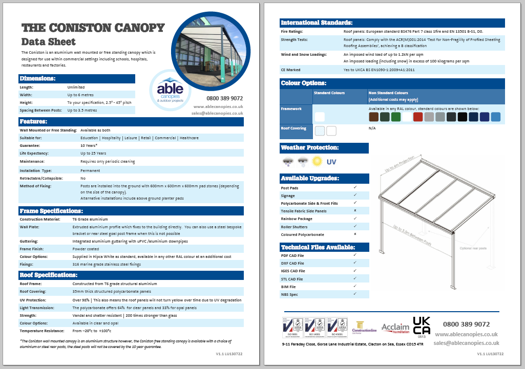 To give you a sneak peek, click on the image below to view and download the Coniston Canopy product data sheet. The Coniston is our most popular canopy due to its versatility, durability and value for money.