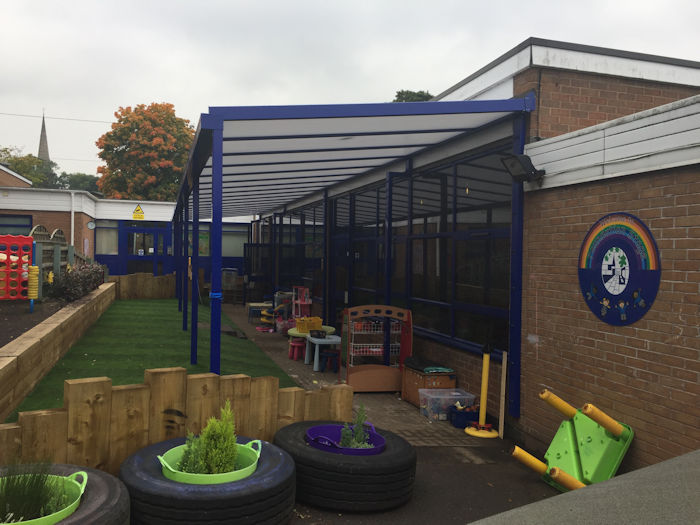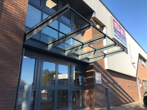 To fit in with the design and materials of the existing entrance area this recent installation in Staffordshire used a Kensington Mono Pitch Wall Mounted Entrance Canopy.