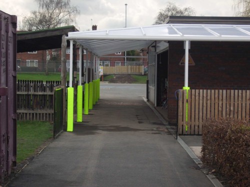 Able Canopies offer free post pads with all wall mounted canopies which are available in 15 different colours. St Nicholas Catholic Primary School chose to have fluorescent yellow post Pads.