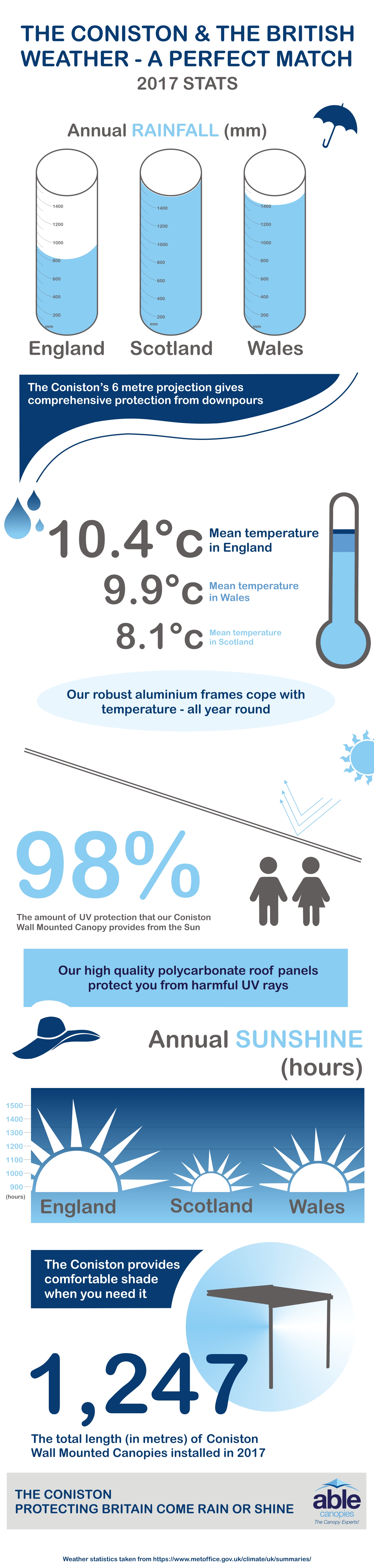 It’ll be no surprise to see that out of England, Scotland and Wales, in 2017 Scotland received the largest rainfall, the least amount of sunshine and the lowest mean temperature. That doesn’t mean that sun protection isn’t required in Scotland, it’s just as important and so are canopies as they provide protection from the sun and the rain – all of the 1.54 metres of rain that fell in Scotland 2017. Now that’s a lot of rain!
