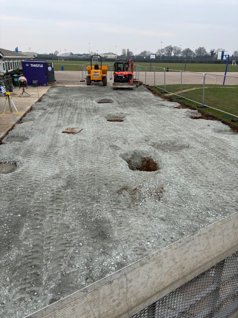 Lonsdale Landscapes carried out initial groundwork preparation between 3-11 March, readying the area for both the canopy installation and artificial grass.