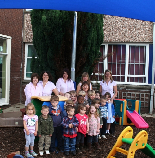 Children and staff of Wordsley Preschool & Playgroup in Stourbridge celebrate the results of their brand new state-of-the-art shade sail system.
